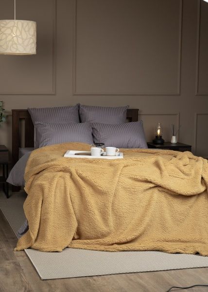 Плед из искусственного меха, его ворс имитирует мех овчину, имеет мягкую и приятную на ощупь текстуру с достаточно коротким ворсом. Благодаря однотонной расцветке он подойдет к любому интерьеру и будет сочетается с любым постельным бельем. В отличие от изделий из натурального меха, его можно стирать в стиральной машине, а после стирки достаточно хорошо встряхнуть, чтобы вернуть ему первоначальный вид. Рекомендации по уходу: машинная стирка до 40 градусов, не сушить в стиральной машине, нельзя гладить, не отбеливать, не подвергать химической чистке.